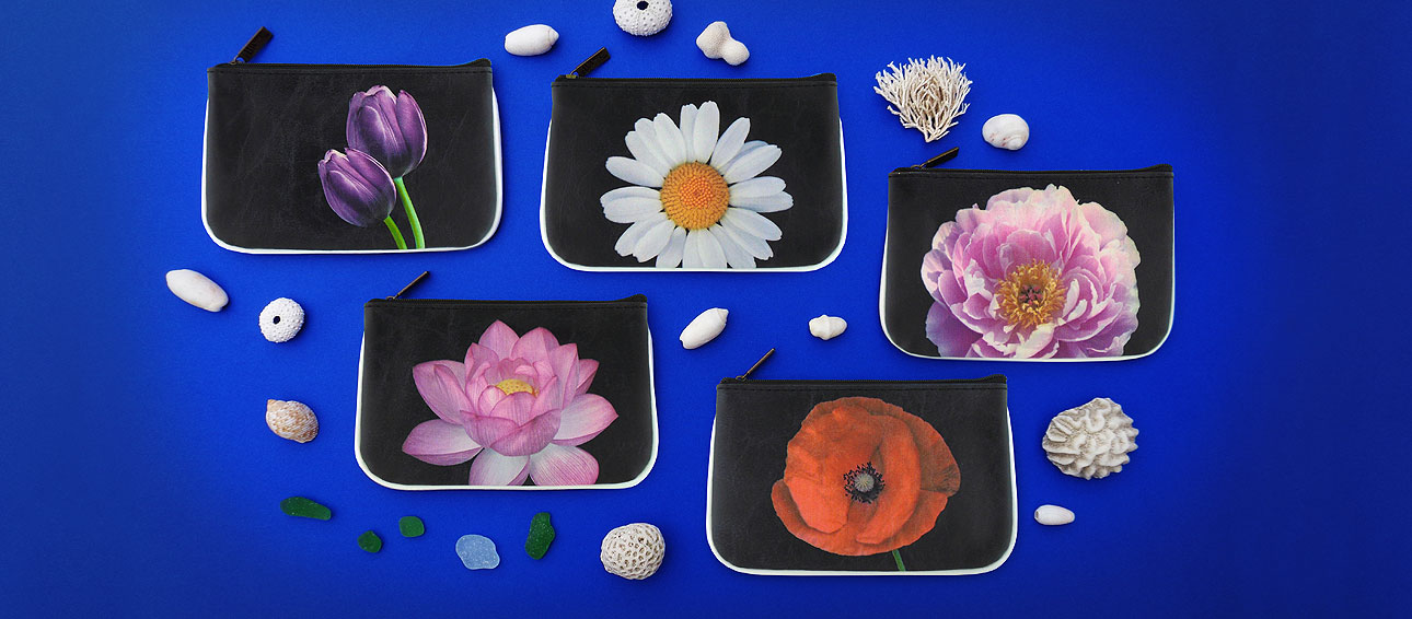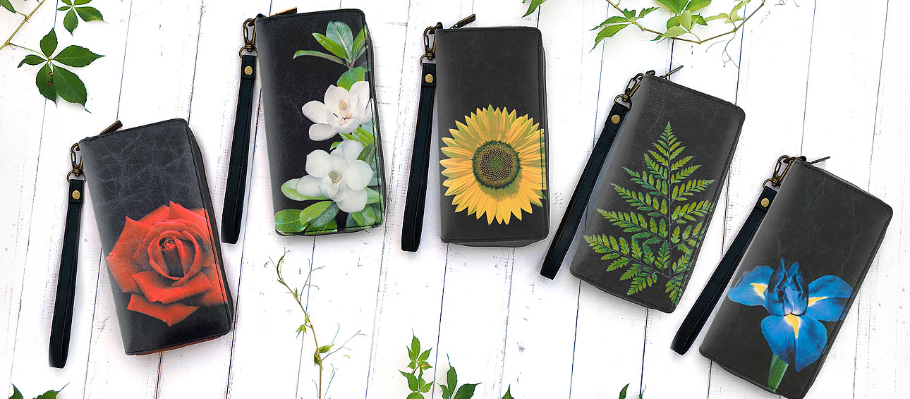 Our Flower collection was inspired by these fascinating flowers to create these vegan leather fashion accessories with bold patterns. This collection contains cross body bags, flat wallets, large wristlet closure wallets, vintage style kiss lock frame coin purses, small pouches, luggage tags, cardholders and tablet sleeves. You can find lovely flowers like rose, lotus, tulips, daisy, orchid, magnolia, sunflower, iris, peony, poppy, lily, fern and mushroom from this collection.